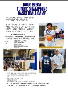 This camp is for boys and girls entering grades 3-8 and will take place June 8-11th at Hopewell High School. The neat thing is that the campers will be instructed by various members of the Hopewell boys and girls varsity teams along with the Hopewell Boys Varsity coaching staff.